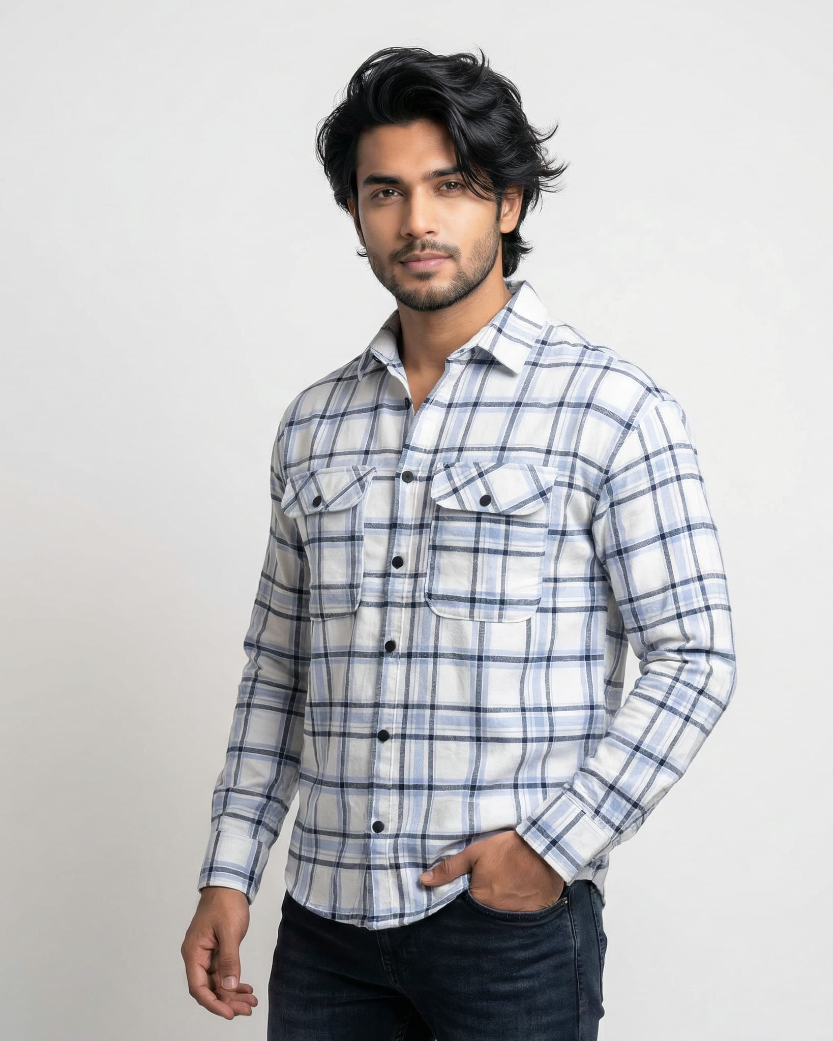 Arctic Grid Check Shirt with clean blue-grey plaid detailing—comfortable regular fit, perfect for casual & smart-casual wear.