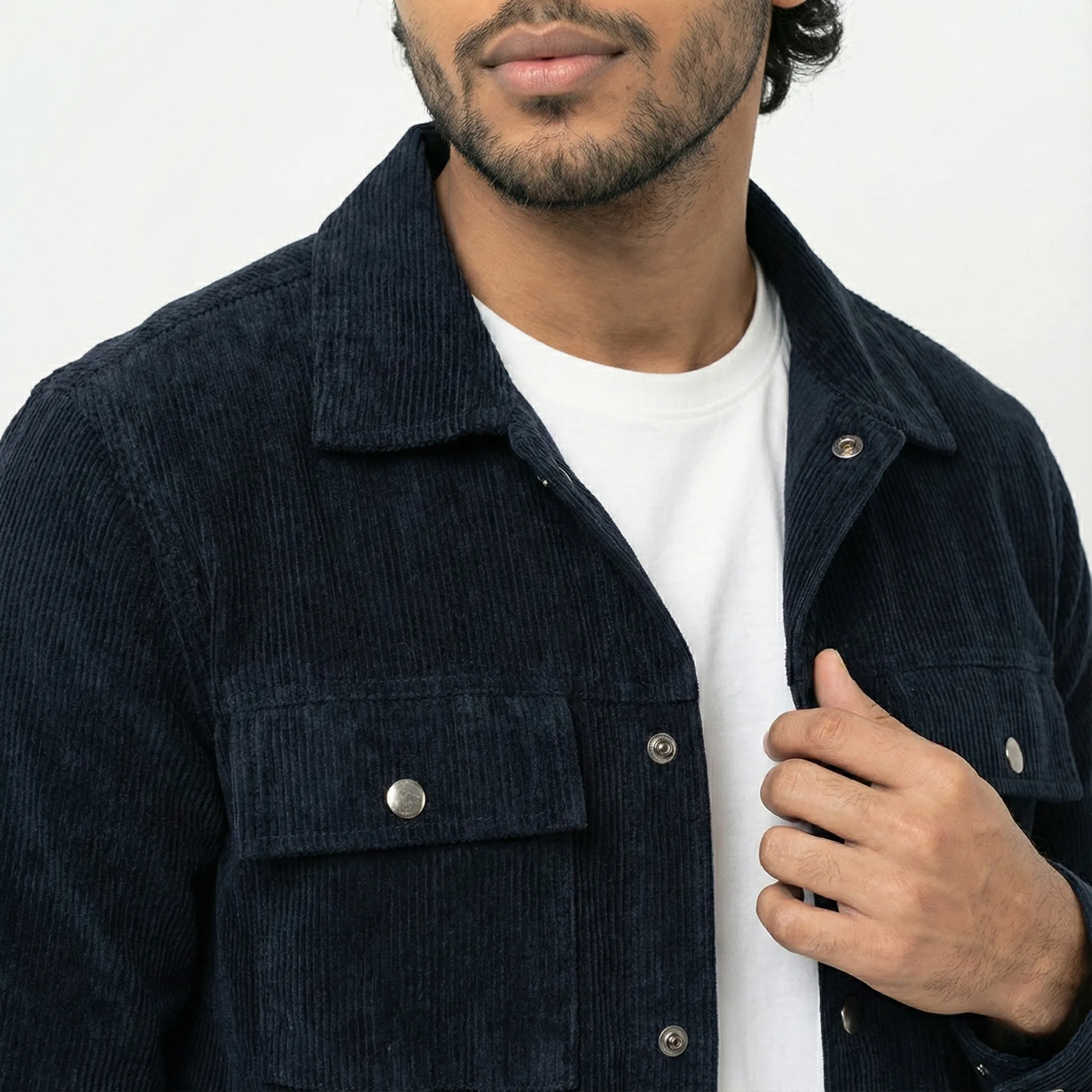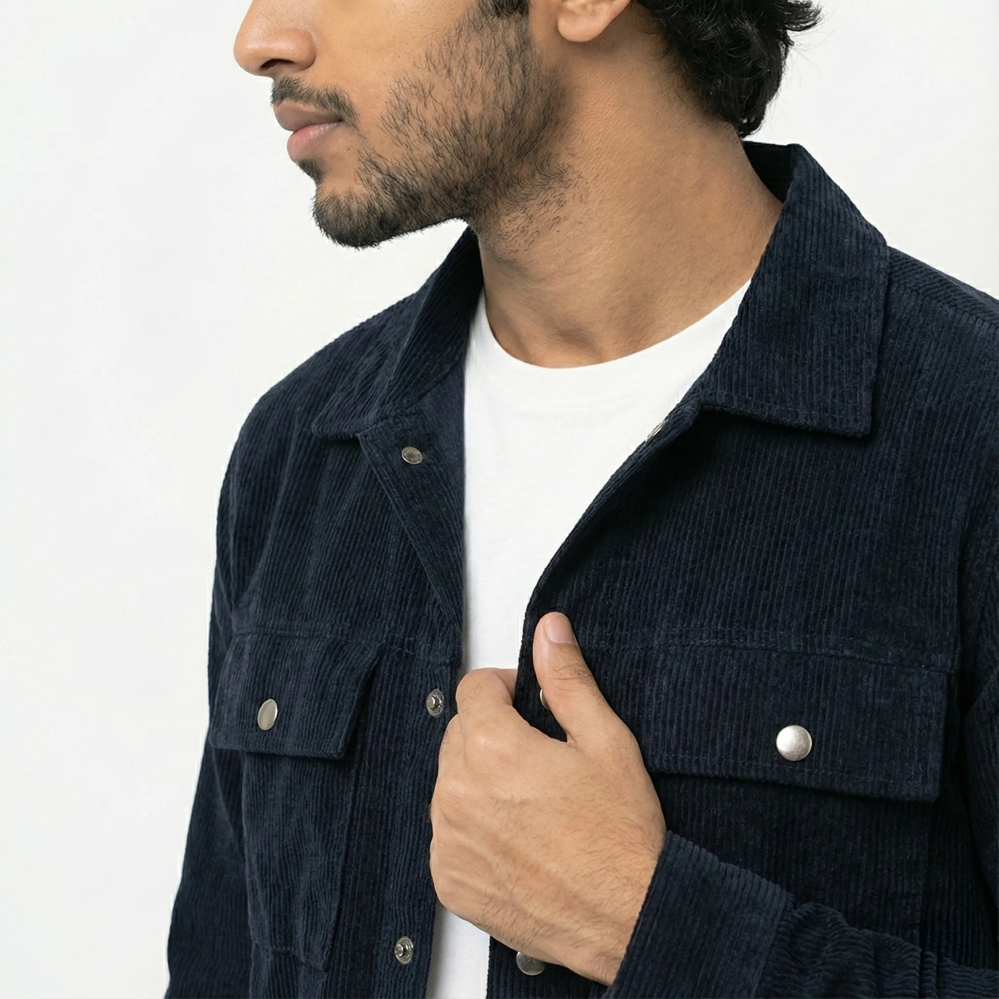 Soft brushed Black Corduroy Jacket with a relaxed, layering fit—snap-button front, spread collar, and chest pocket for effortless everyday style.
