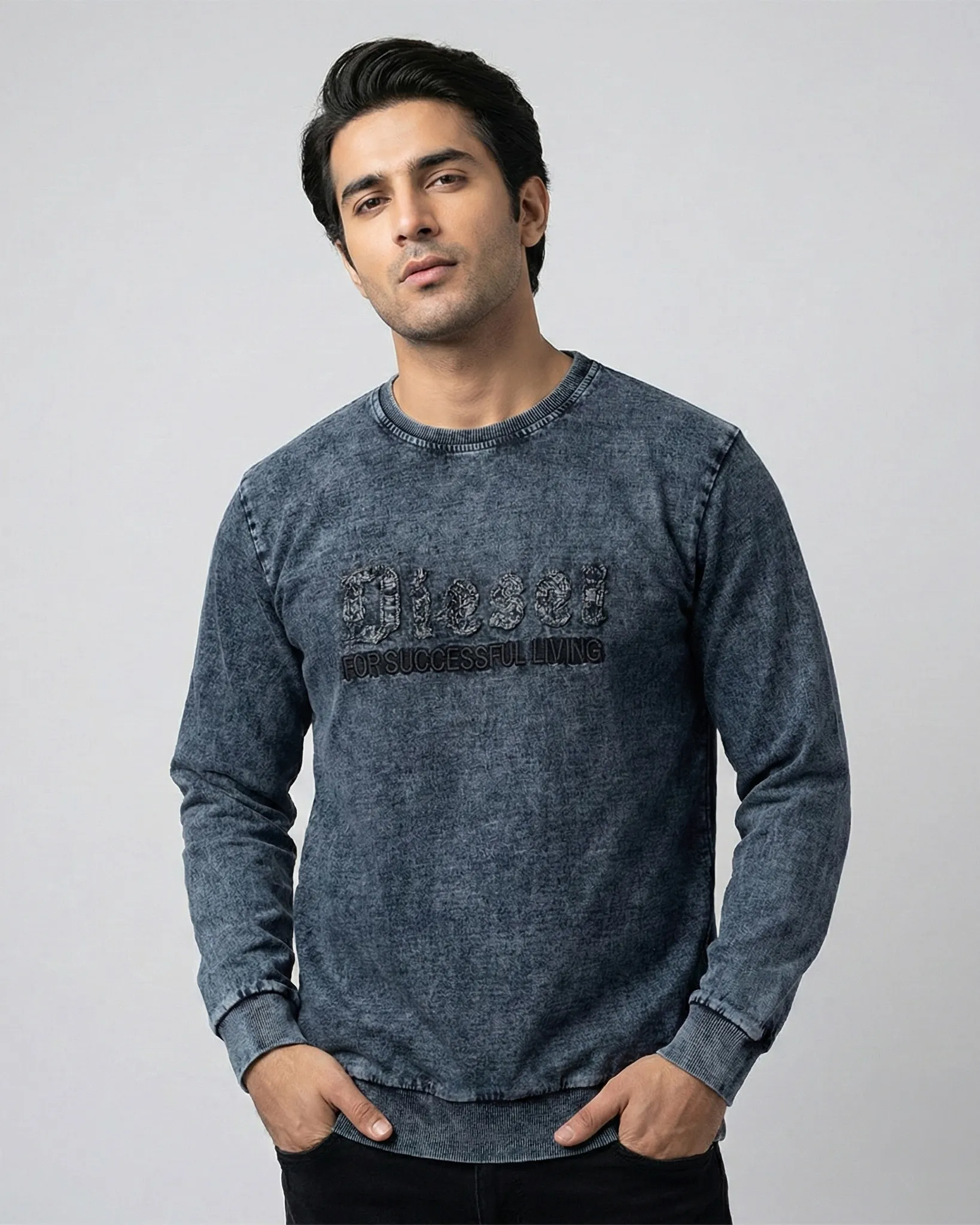 Dark Navy Washed Sweatshirt with “Diesel for Successful Living” embroidery, ribbed cuffs, and a cozy fit. Perfect for casual wear and layering.