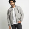 Mocha suede-look varsity with snap buttons, striped rib trims, and bold embroidery—easy comfort, instant statement.